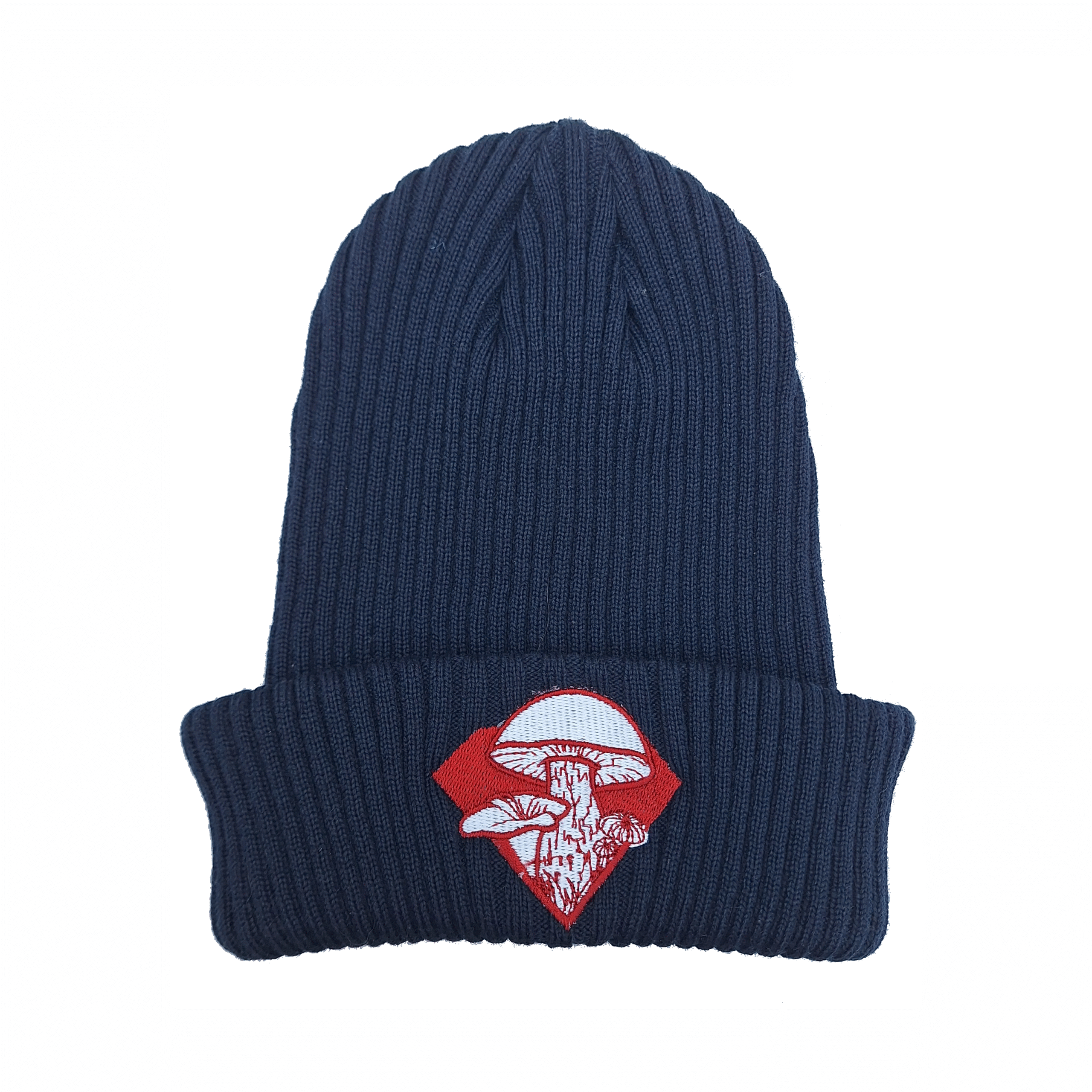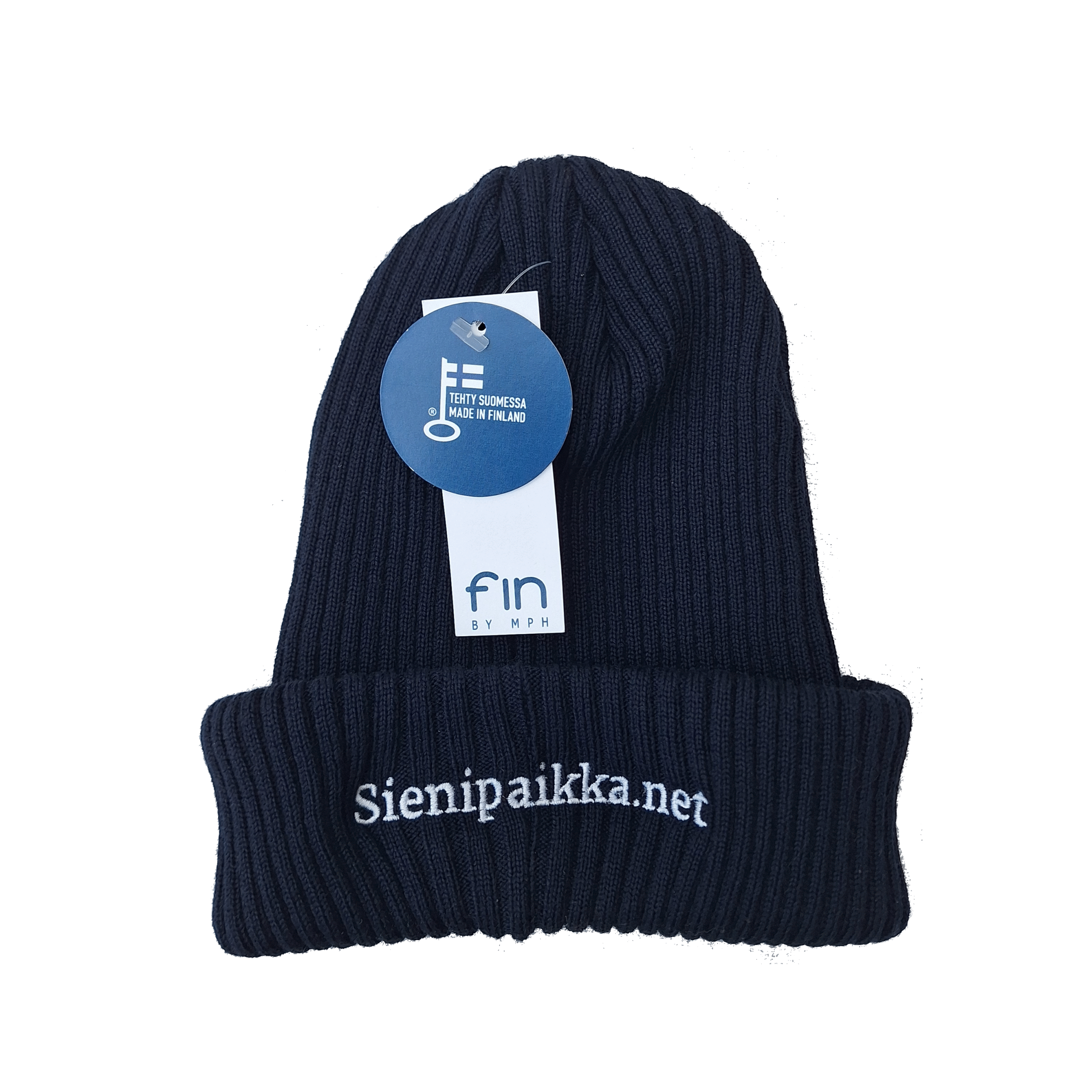 Tyylikäs ja laadukas pipo, jossa Sienipaikan logo edessä ja takana Sienipaikka.net -teksti.